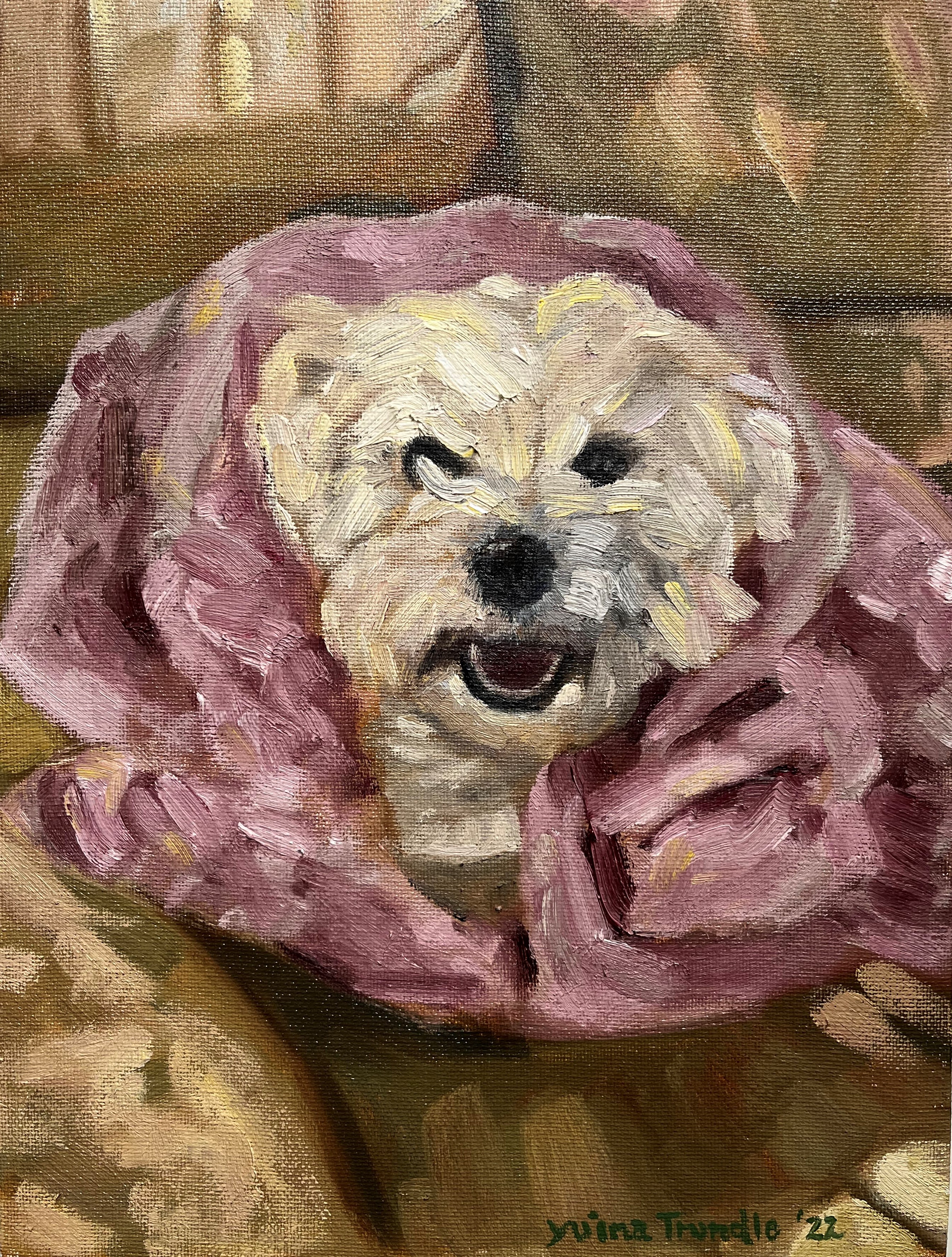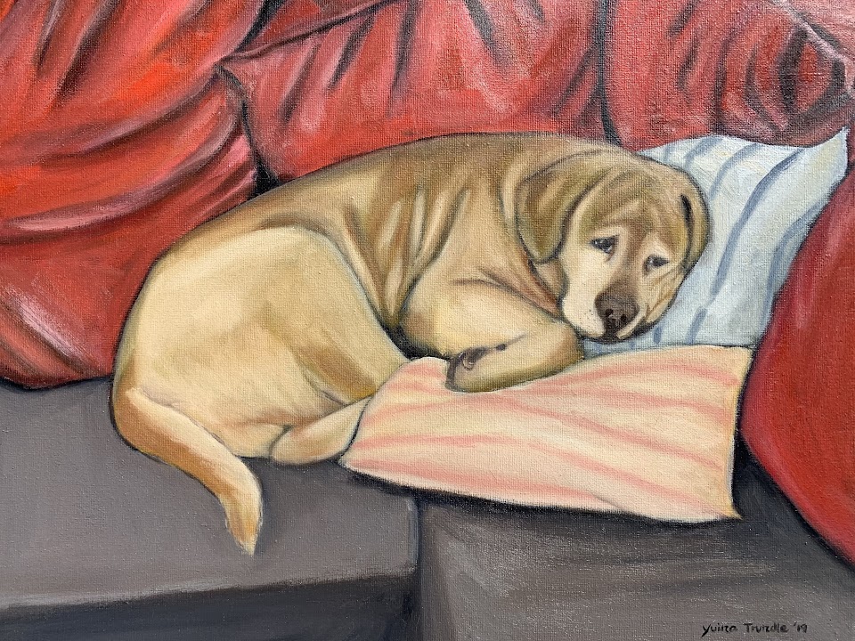 When she's not painting or knitting, she can usually be found going for walks, spending quality time with her family, or enjoying a well-deserved nap.